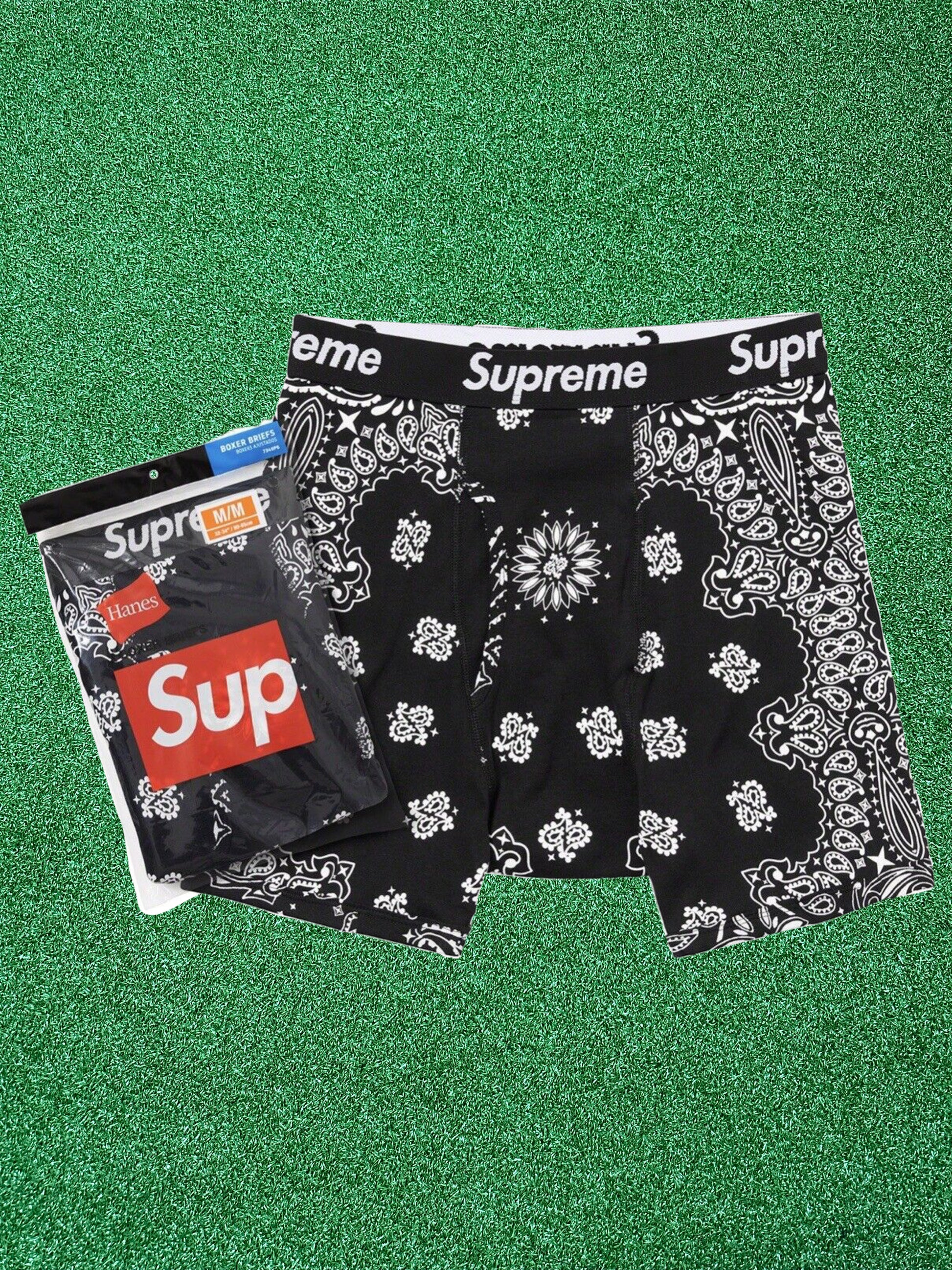 Presentamos el paquete de 2 calzoncillos tipo bóxer con bandana Supreme Hanes en un rojo espectacular. Estos calzoncillos tipo bóxer, confeccionados en 100 % algodón, presentan un estampado de bandana exclusivo y la marca icónica Supreme en la cinturilla. Estos calzoncillos tipo bóxer brindan comodidad y estilo.