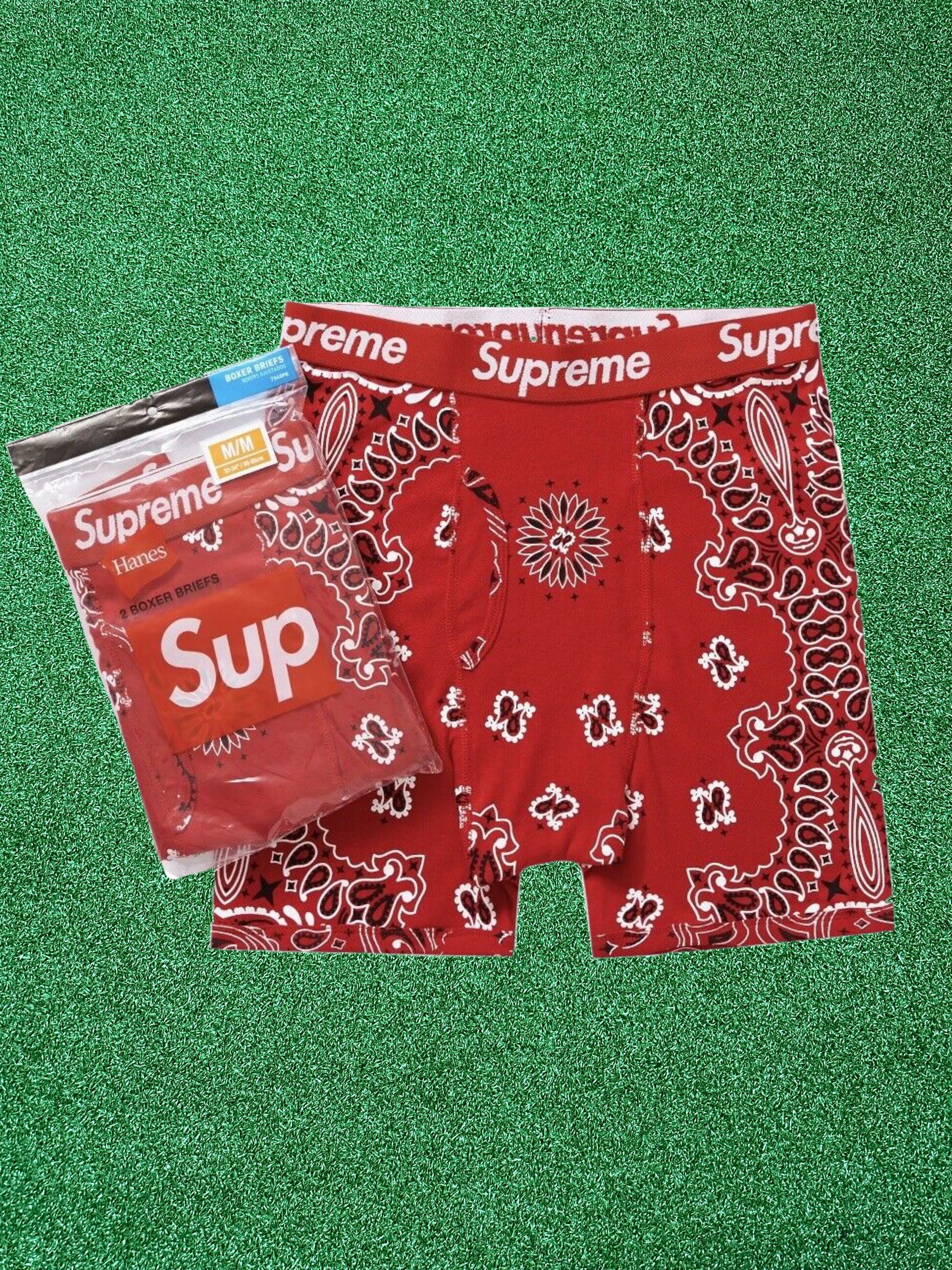 Presentamos el paquete de 2 calzoncillos tipo bóxer con bandana Supreme Hanes en un rojo espectacular. Estos calzoncillos tipo bóxer, confeccionados en 100 % algodón, presentan un estampado de bandana exclusivo y la marca icónica Supreme en la cinturilla. Estos calzoncillos tipo bóxer brindan comodidad y estilo.